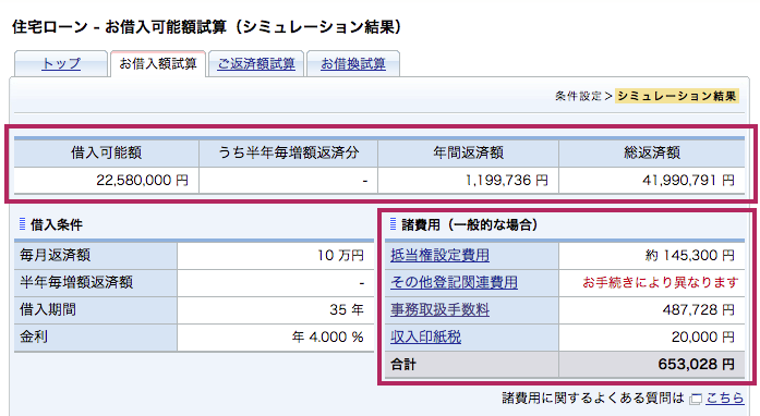 借入可能額、年間返済額、総返済額、諸費用のシミュレーション結果が表示されます。