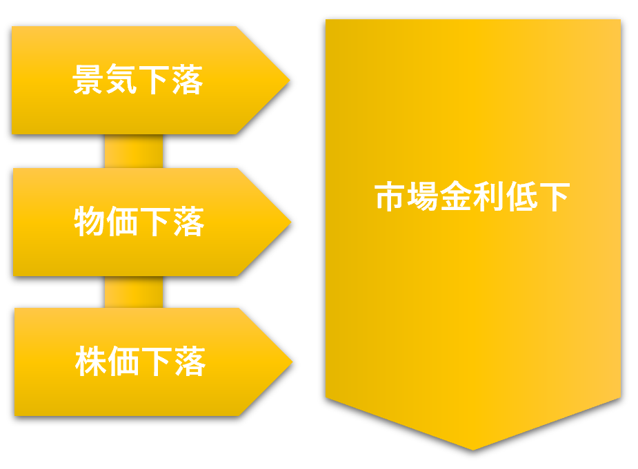 反対に、景気が下降すると資金需要が減少するので市場金利も低下します。